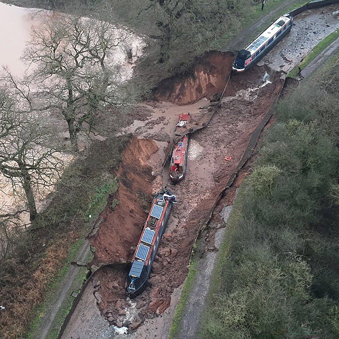 A canal breach early Monday sent two narrowboats tumbling into a sinkhole and left others stranded, caused by the collapse of an artificial embankment that had stood...